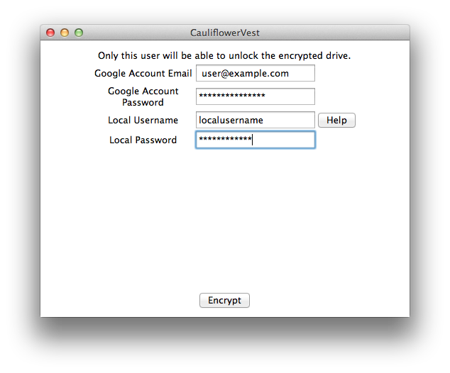 Users are prompted to enter a Google Account password, for authentication with Google App Engine, and a local account, used to enable FileVault 2.
