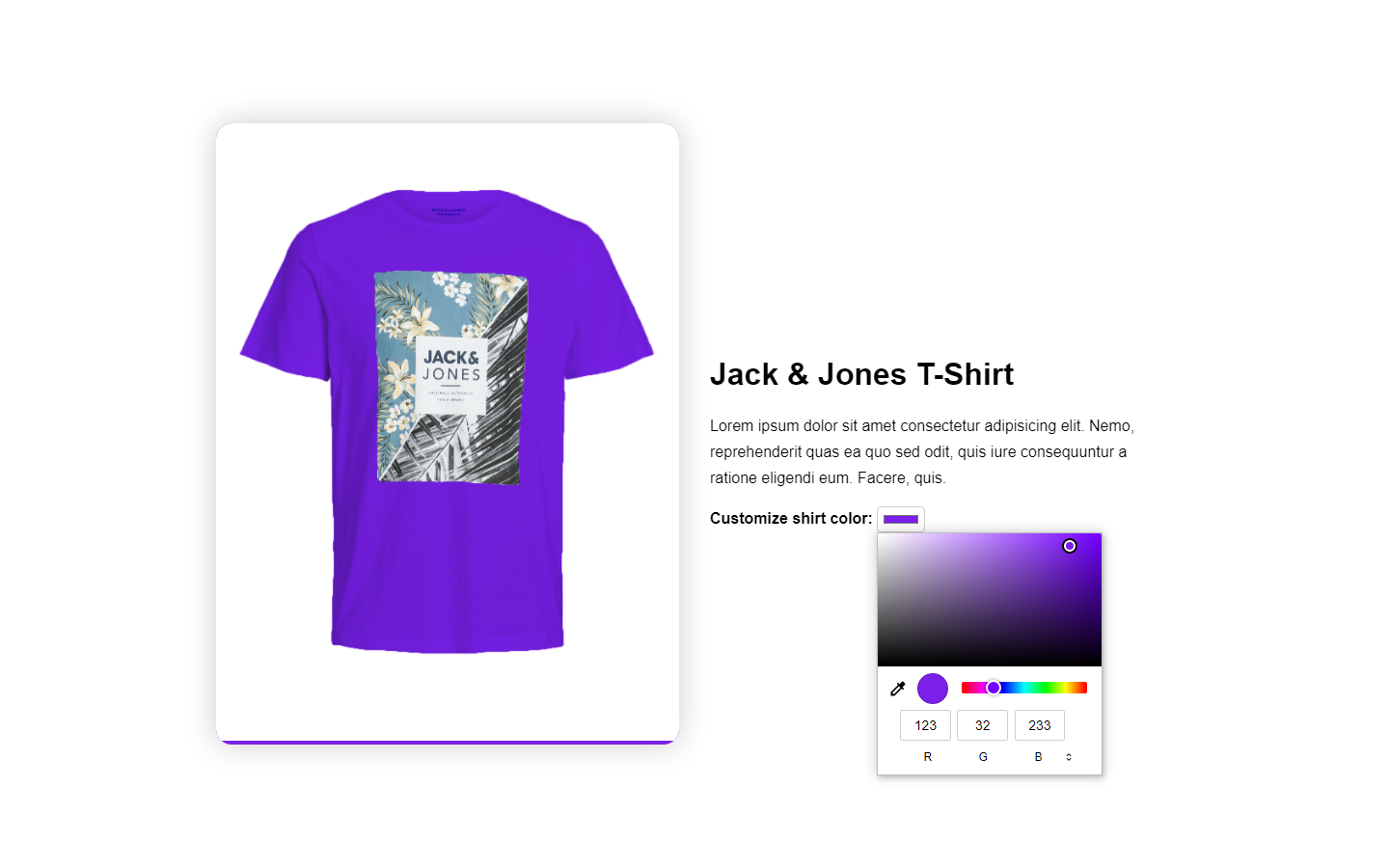 - Users can change the color of the product image using a color picker