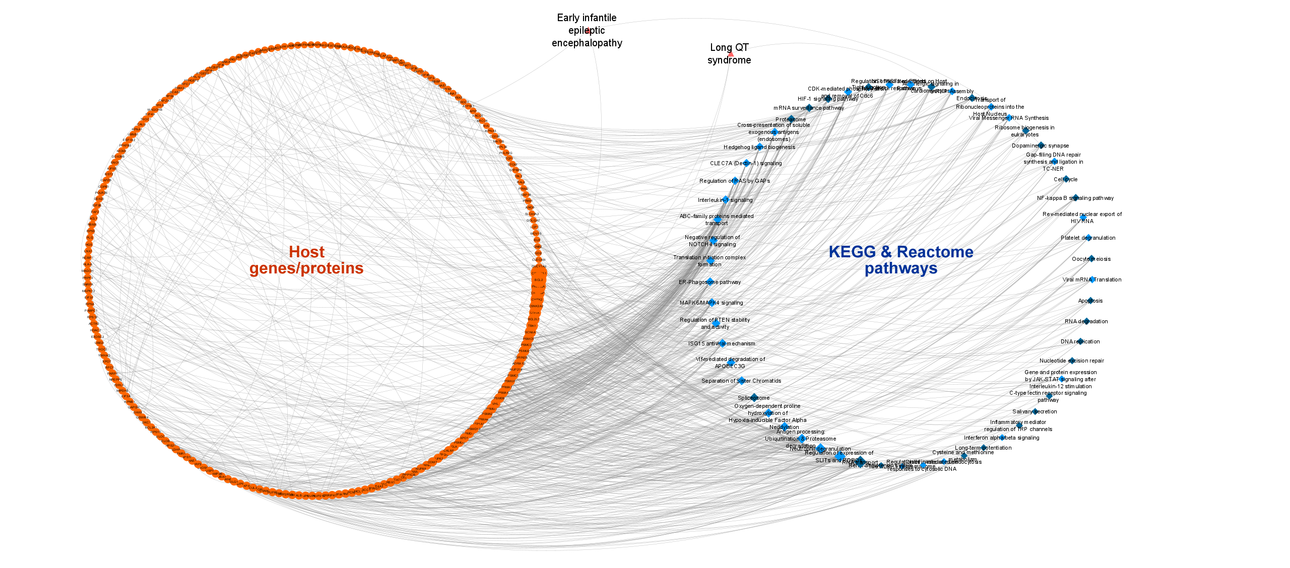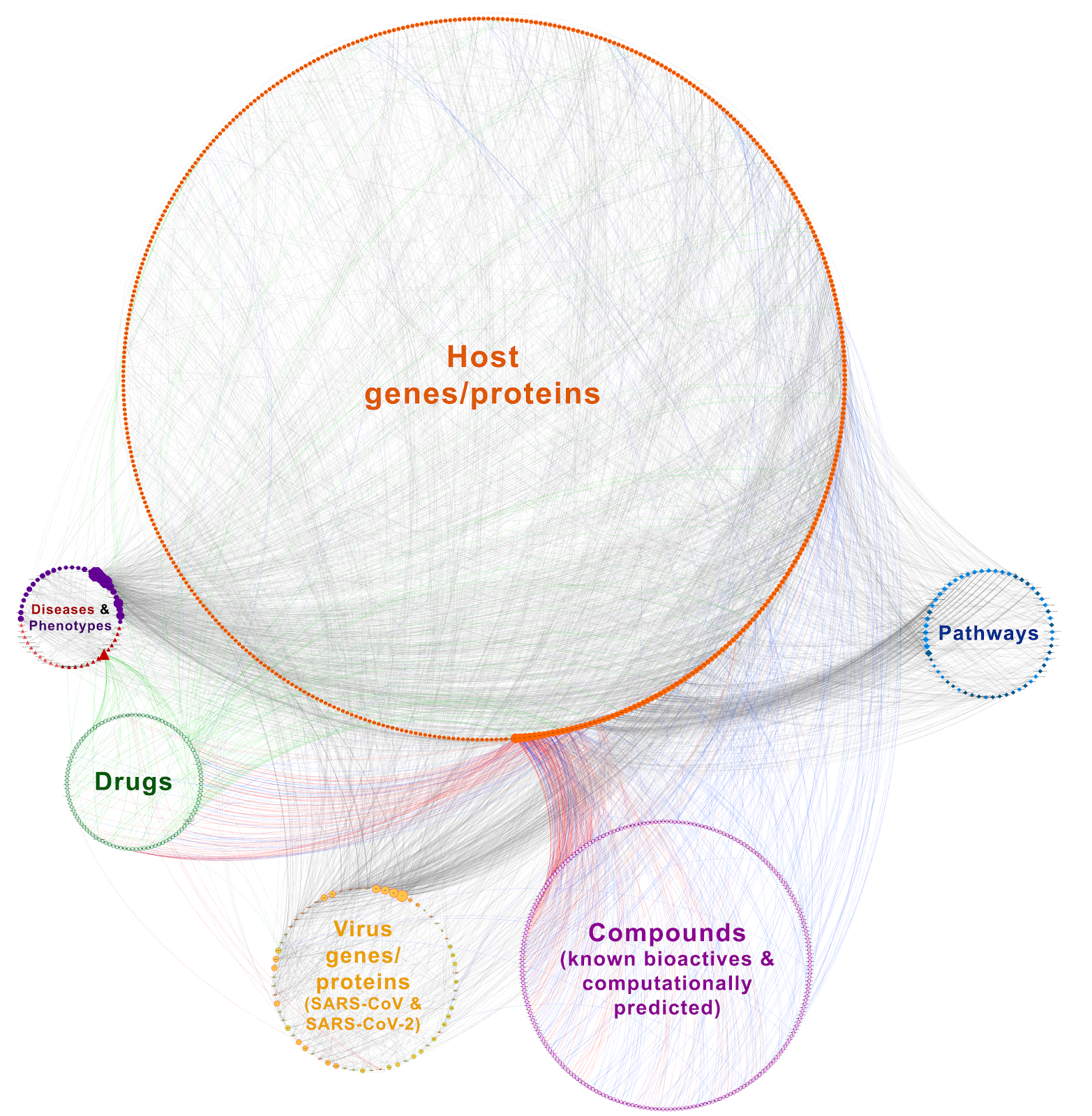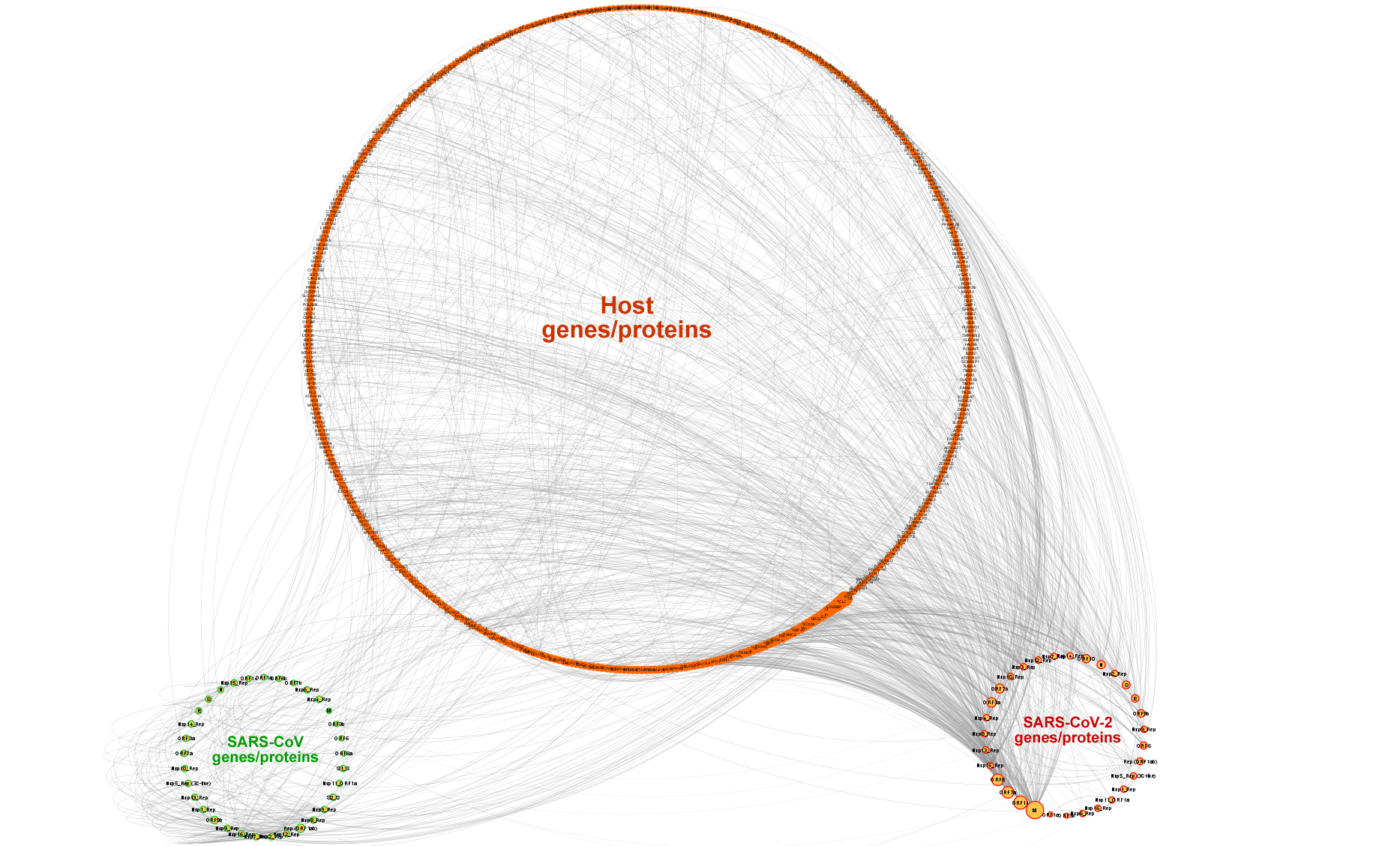 - The finalized number of genes/proteins is 539 (475 host genes/proteins, and 33 SARS-CoV and 31 SARS-CoV-2 genes/proteins) and the number of edges (i.e., PPIs) is 1284.