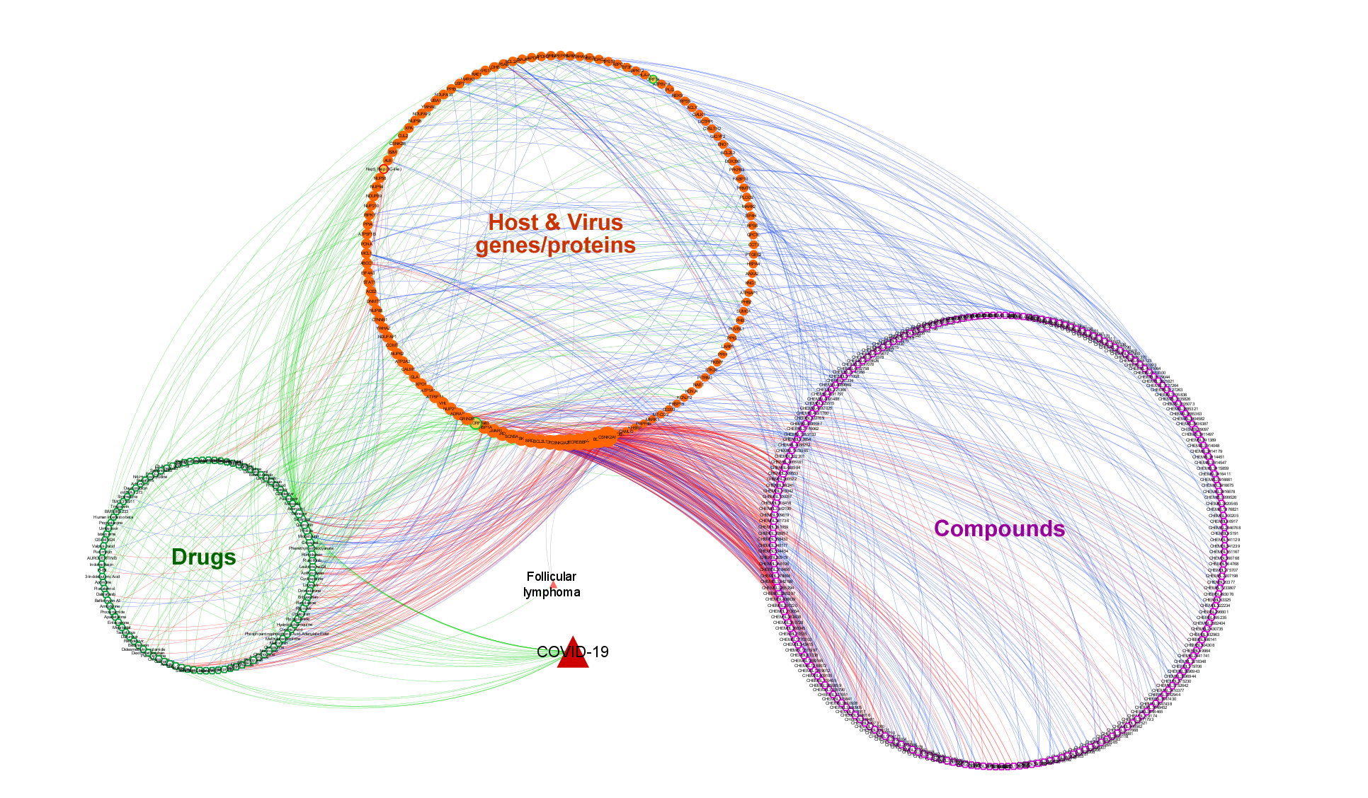 - COVID-19 related genes/proteins and their interactions were retrieved from the IntAct database’s COVID-19 dataset, which contain 1,172 gene/protein and metabolite nodes from various organisms and 2,214 edges.