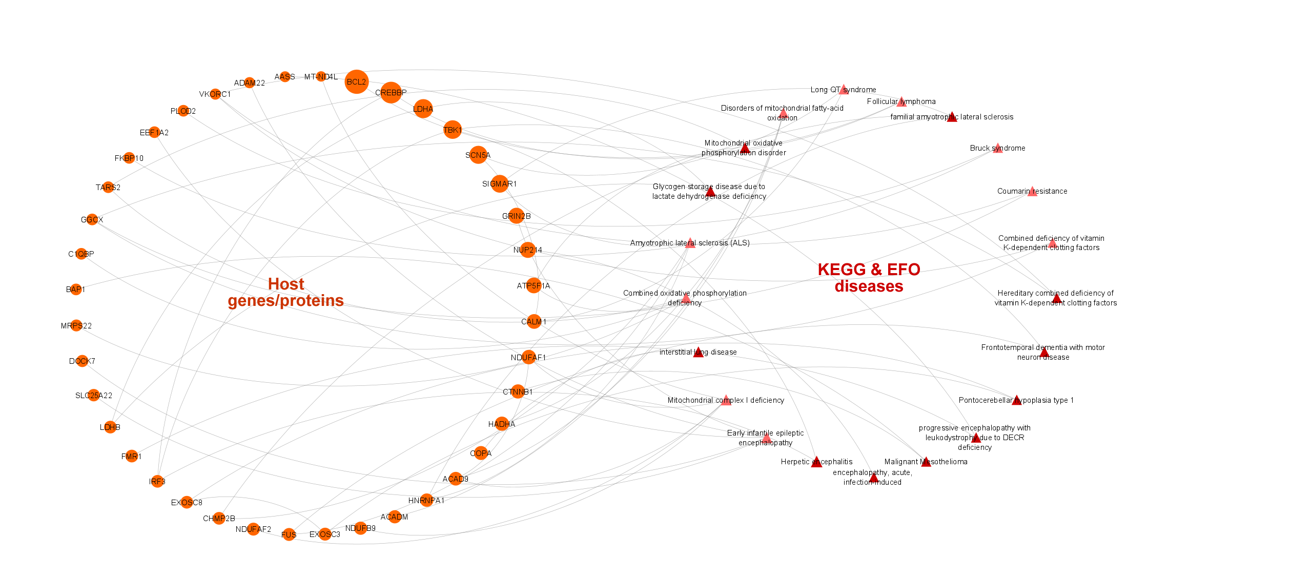 - The finalized number of disease terms in the KG is 23 (10 for KEGG and 13 for EFO) and the number of disease - gene/protein associations (edges) is 52 (31 for KEGG and 21 for EFO).