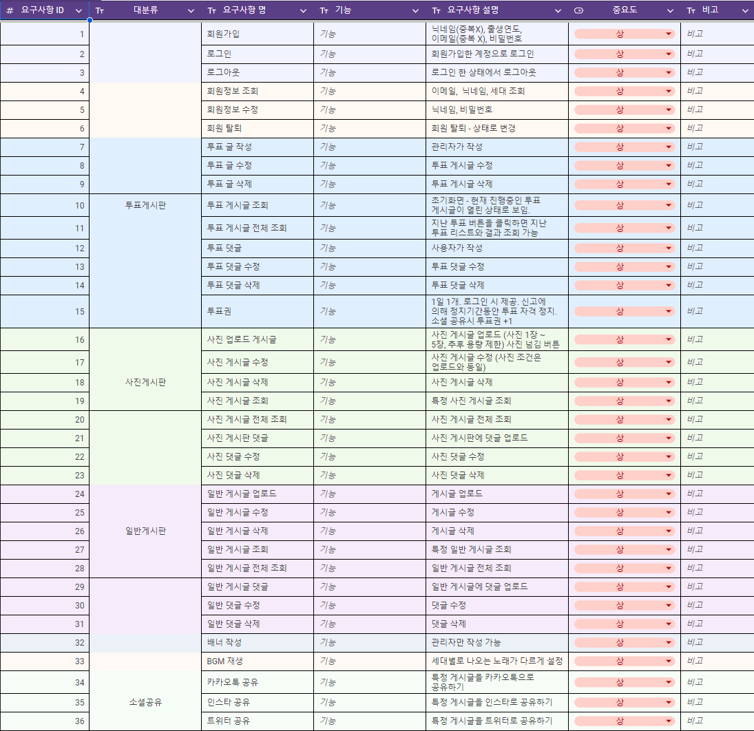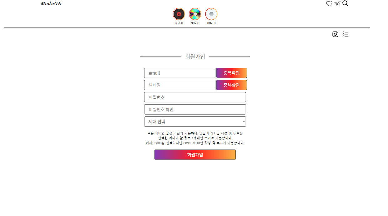| 회원가입 | POST | /members | 회원이 아이디, 닉네임, 비밀번호, 세대를 입력하여 회원가입. |