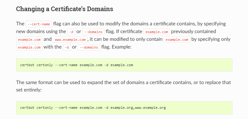 certbot certonly --cert-name example.com -d example.com -d www.example.com -d api.example.com ...