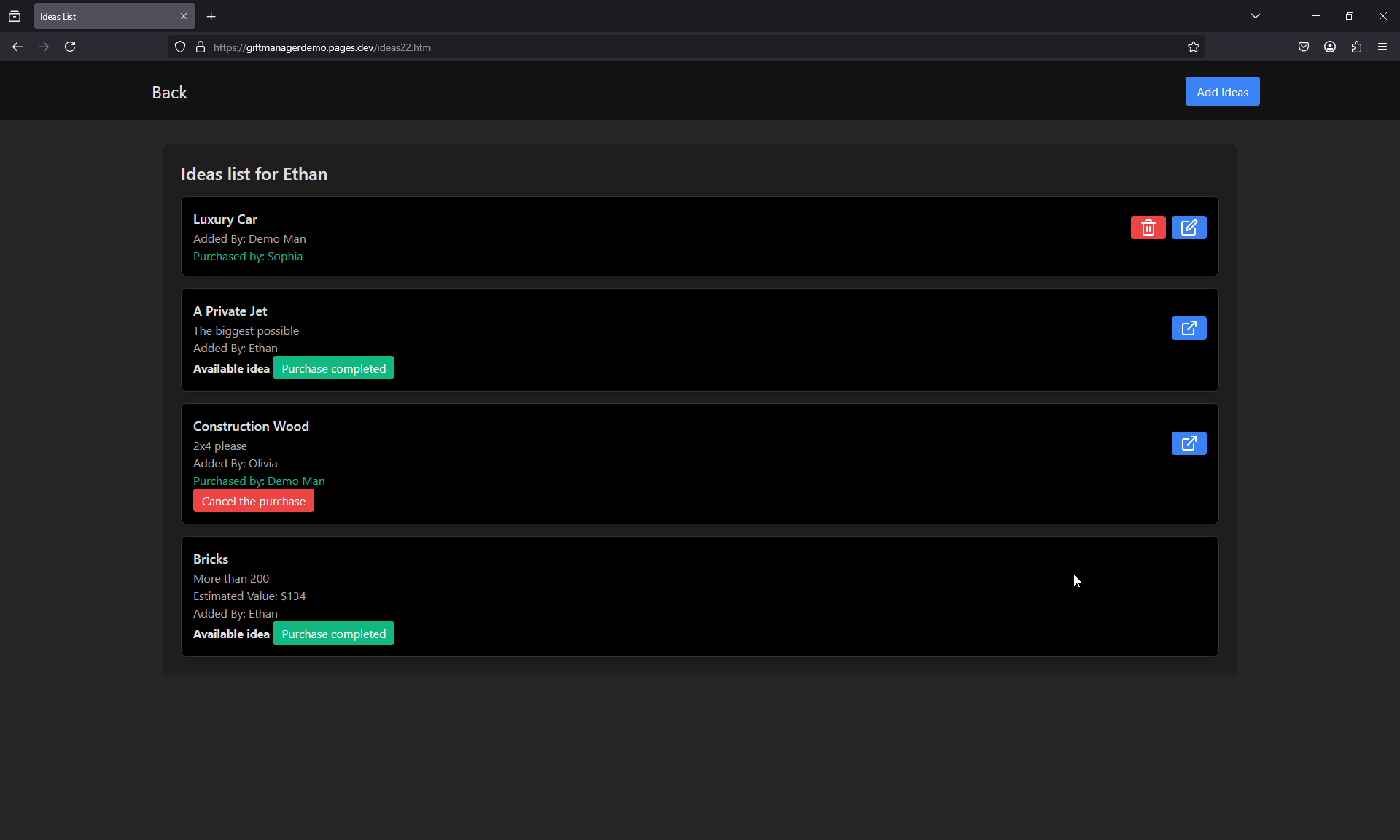 - Add and edit gift ideas for yourself and others.