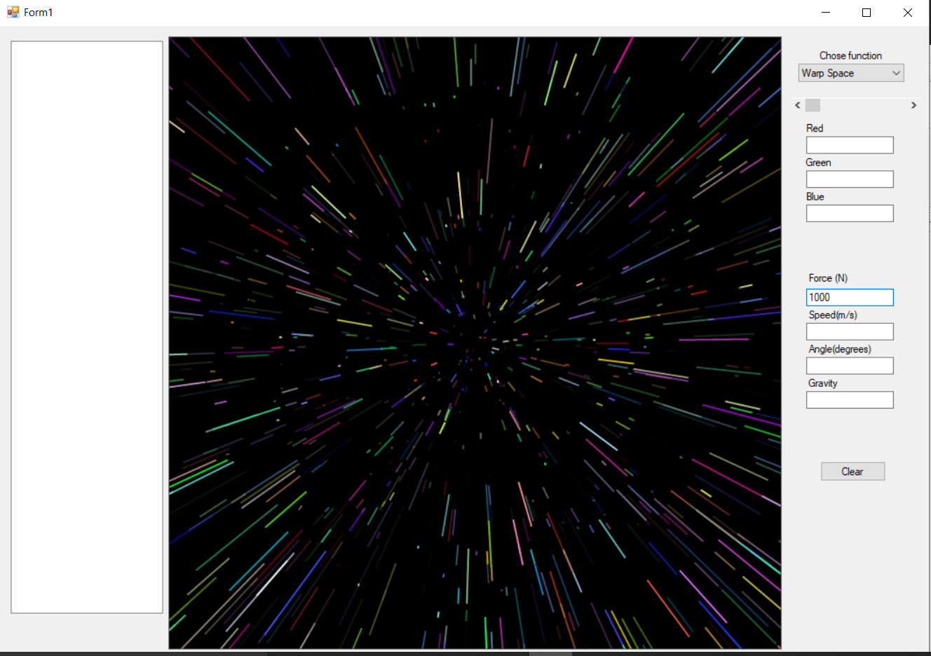 This program started as silly application, but latere I kept adding more stuff to It, and eventually became an experimentation playground. It encompases several functionalities ranging from small physics application (throwing a ball in a controled environment and adjusting the parameters) to some CGI effects(Like in stark trek reaching warp-speed)