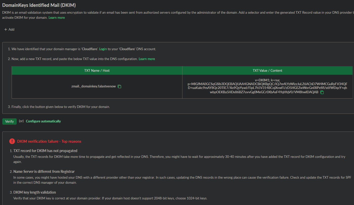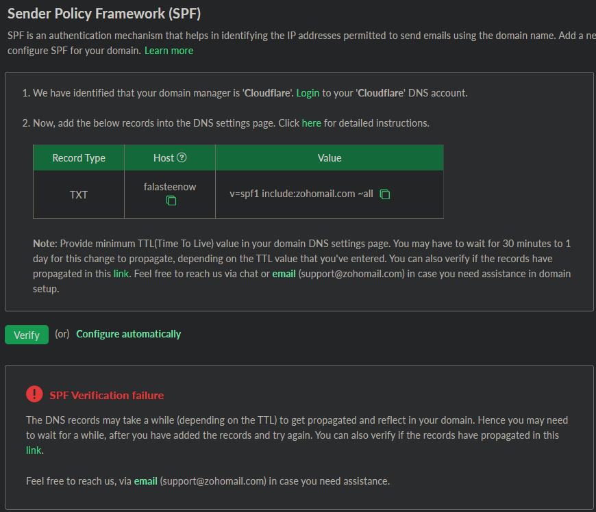 In reference to my previous PR, where I added MX, SPF and DKIM records, until now the verifications have been unsuccessful for my intended purpose of using alias email for falasteen@zohomail.com as yezz@falasteenow.is-amaz.ing.