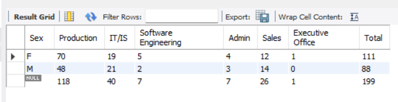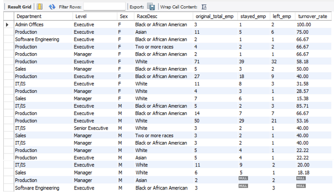 - All male Asian managers in production and all male Black or African American executives in the software engineering department (refer to the last 2 rows of the result) had left the company. This might be due to the lack of promotion opportunities or their jobs do not allow them to grow professionally.