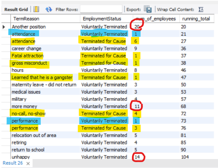 - Calculate the number and the running total of terminated employees as well as their respective termination reasons.
