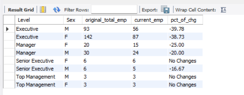 - Calculate the original number of employees, the number of current employees, and the percentage of change in the number of employees by job level and gender.