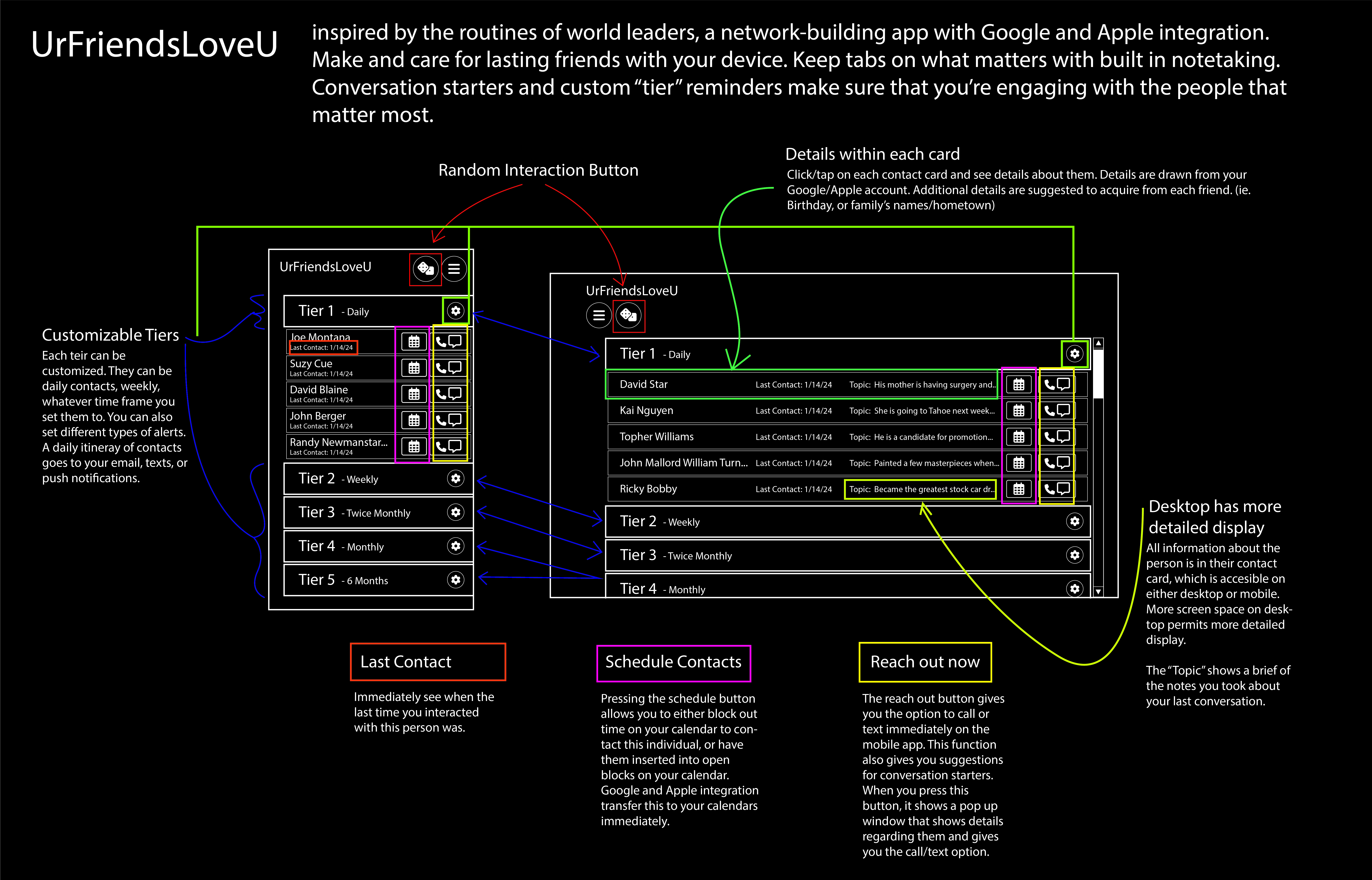 Custom tiers with custom periodic reminders prompt the user to stay in contact with the members of their phonebook--and when the user indicates that they've recently spoken, the user is prompted to take down notes on the conversation.