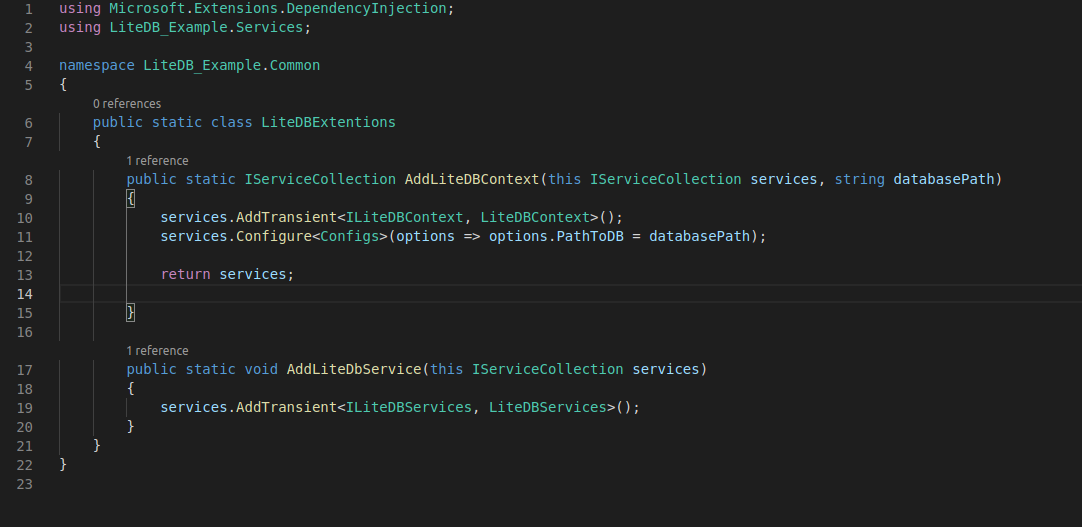 Repare que a classe “LiteDBExtensions.cs”, está sendo usada para facilitar a manutenção e legibilidade do código.