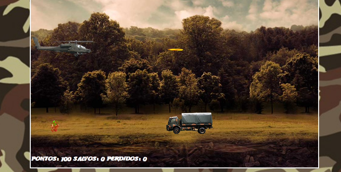 First game only using javascript. It's a game where you control a helicopter that has to save the person running from the truck, meanwhile you can't let the enemy's helicopter pass trough you. You can control him in every direction, it onlys works in a computer, there is no mobile use yet.