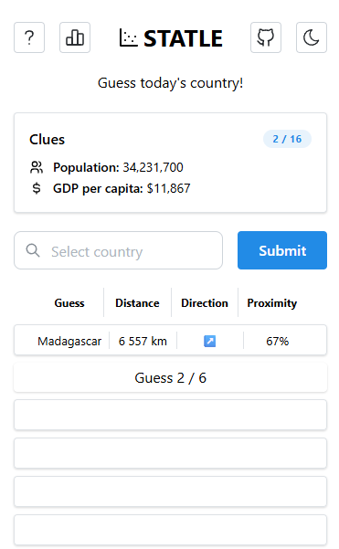 STATLE is a guessing game where players identify a country based on statistics. You have 6 chances to guess the country, with more clues provided after each guess.