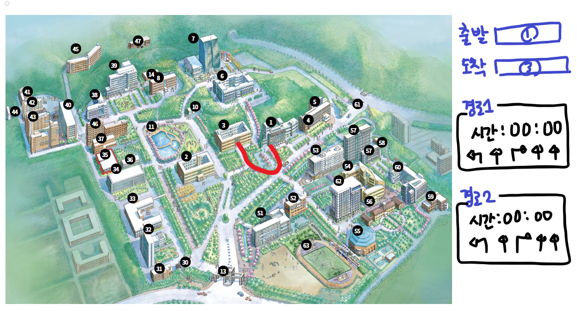 카카오맵 + 카카오처럼 캠퍼스 건물 간 최단 시간과 경로를 계산해주는 서비스이다.