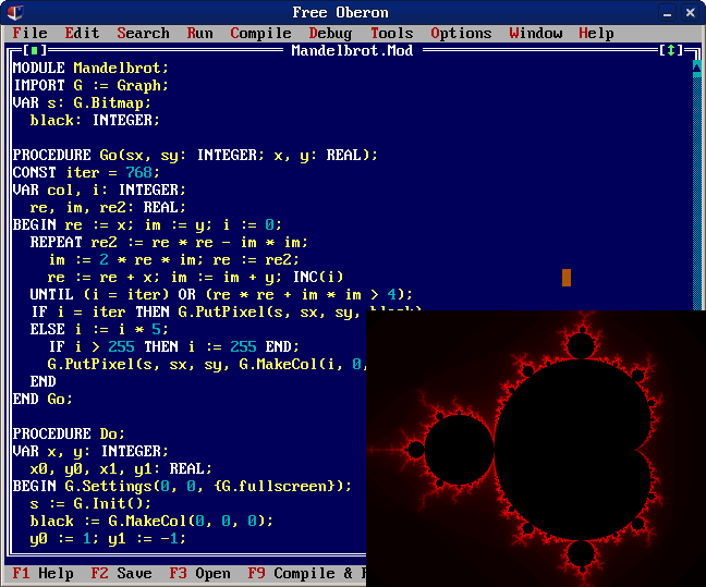 Запустите Free Oberon и наберите текст программного модуля на языке Оберон (или откройте файл с примером программы, например Life.Mod). Нажмите F9, чтобы скомпилировать и запустить программу.