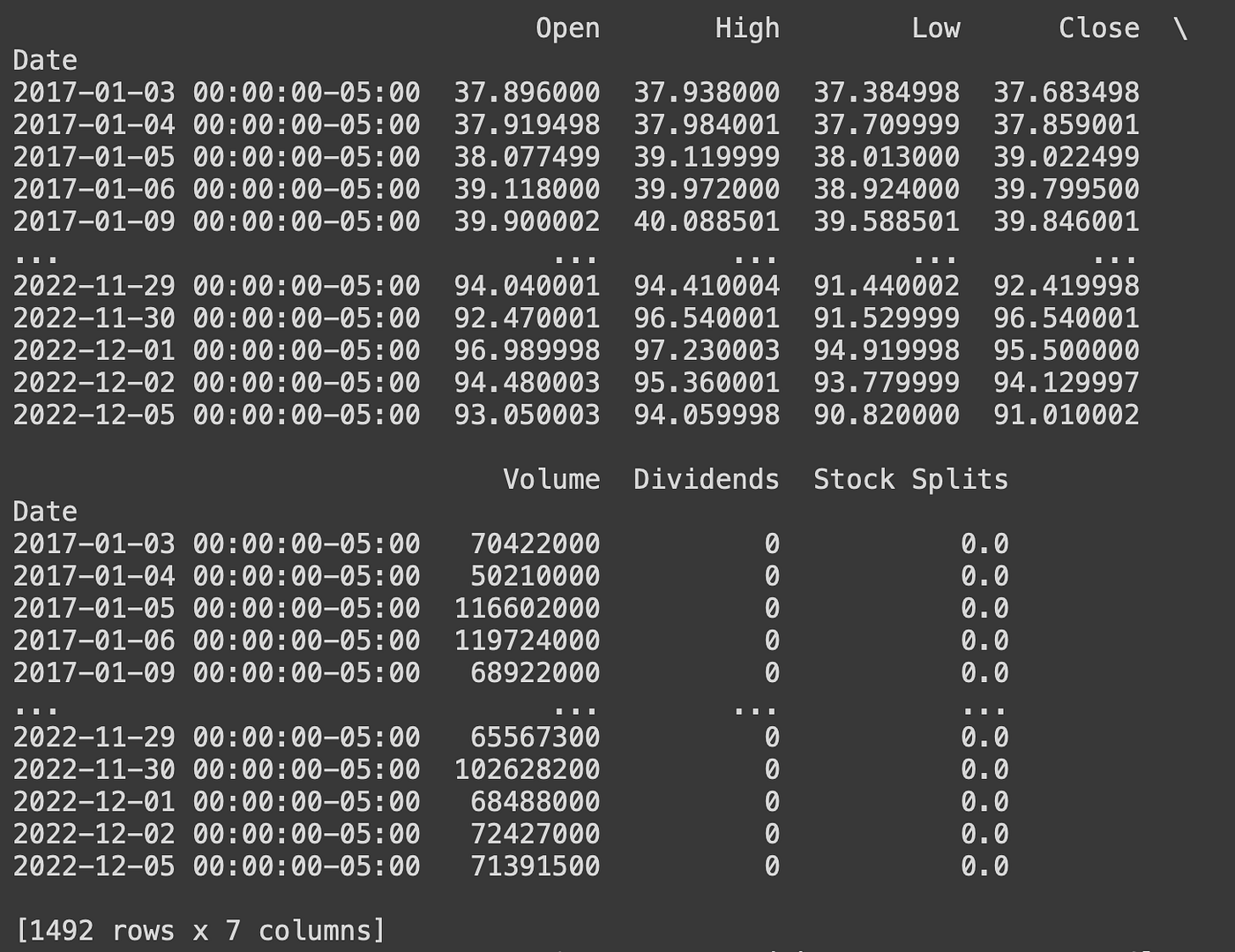 import yfinance as yffrom datetime import datetimeamzn = yf.Ticker("AMZN")end_date = datetime.now().strftime('%Y-%m-%d')amzn_hist = amzn.history(start='2017-01-01',end=end_date)print(amzn_hist)