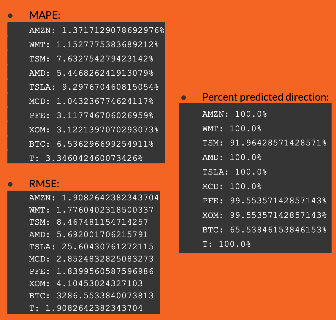 We calculated the Mean Absolute Percentage Error (MAPE), the Root of Mean Squared Error (RMSE), and the percentage of days that the prediction was in the right direction on our models.