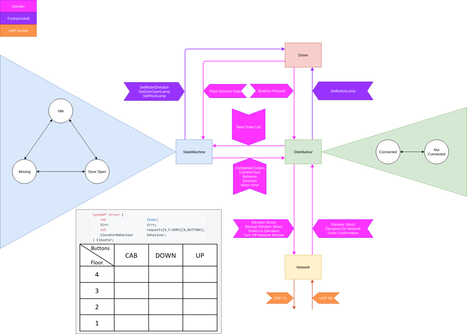 We wrote the elevator system in Golang and devided the system into four main modules; statemachine, distributor, driver and nettwork. The four modules and its interface of is shown in the flow diagram below. We're mainly using channels as a way of communcation between the modules with the exception of two functioncalls to the driver module in order to toggle the lights. The picture below also shows the elevator struct that is passed on the network and from network to distributor