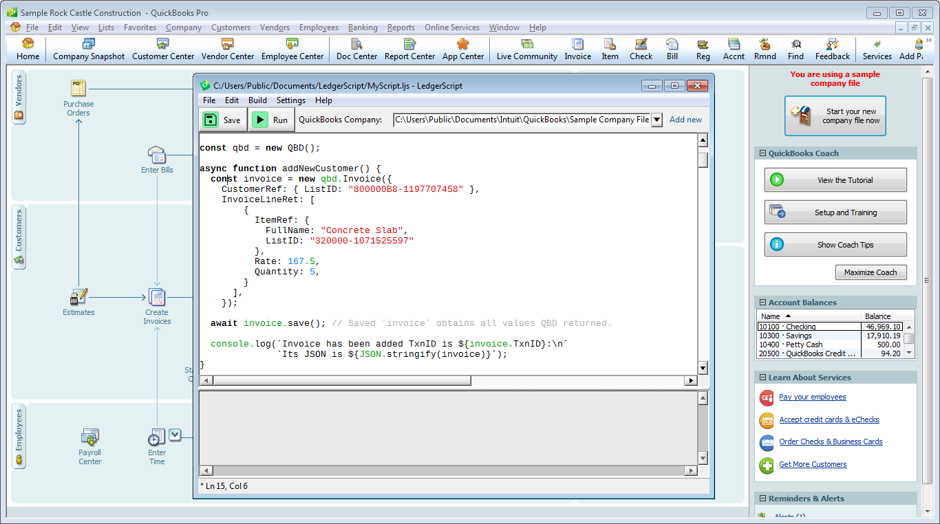 This repository contains samples of scripts for LedgerScript, an application and developer tool that allows JavaScript to work with QuickBooks® Desktop. The code available here is meant to show what LedgerScript and QuickBooks can do.