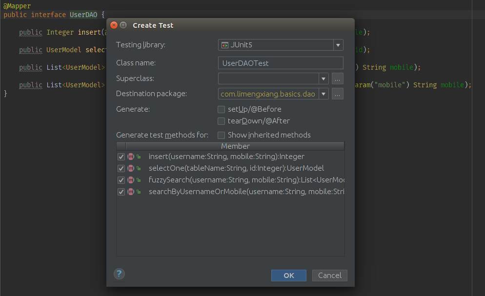 打开UserDAO.java,光标定位到类名,按下Alt + Enter键,在弹出的选项中选择“Create test”,勾选需要测试的方法。