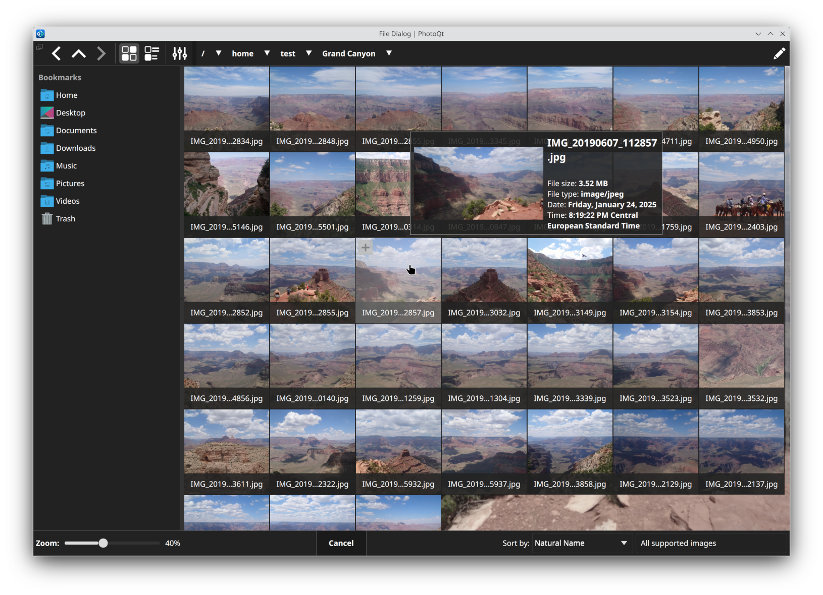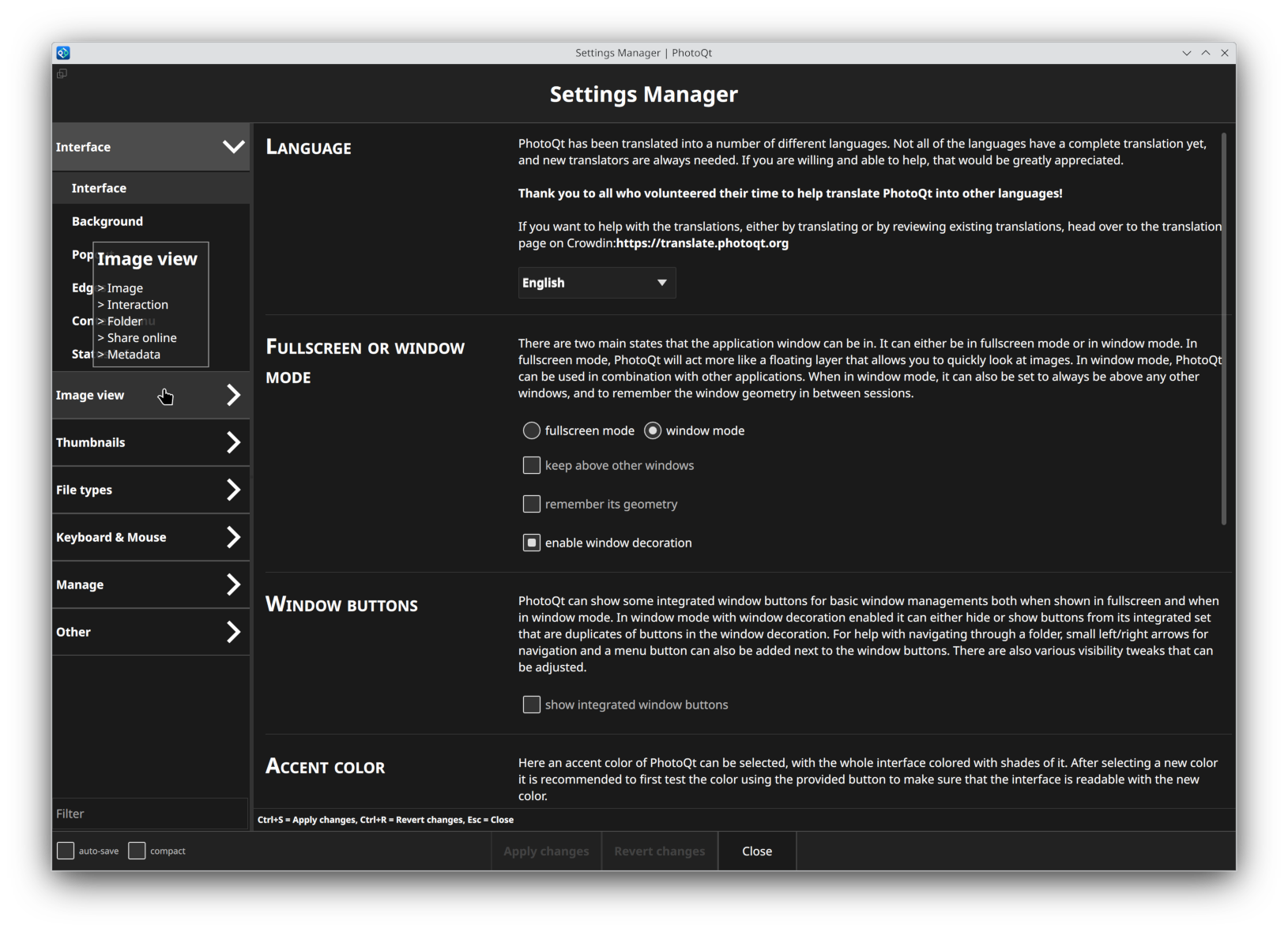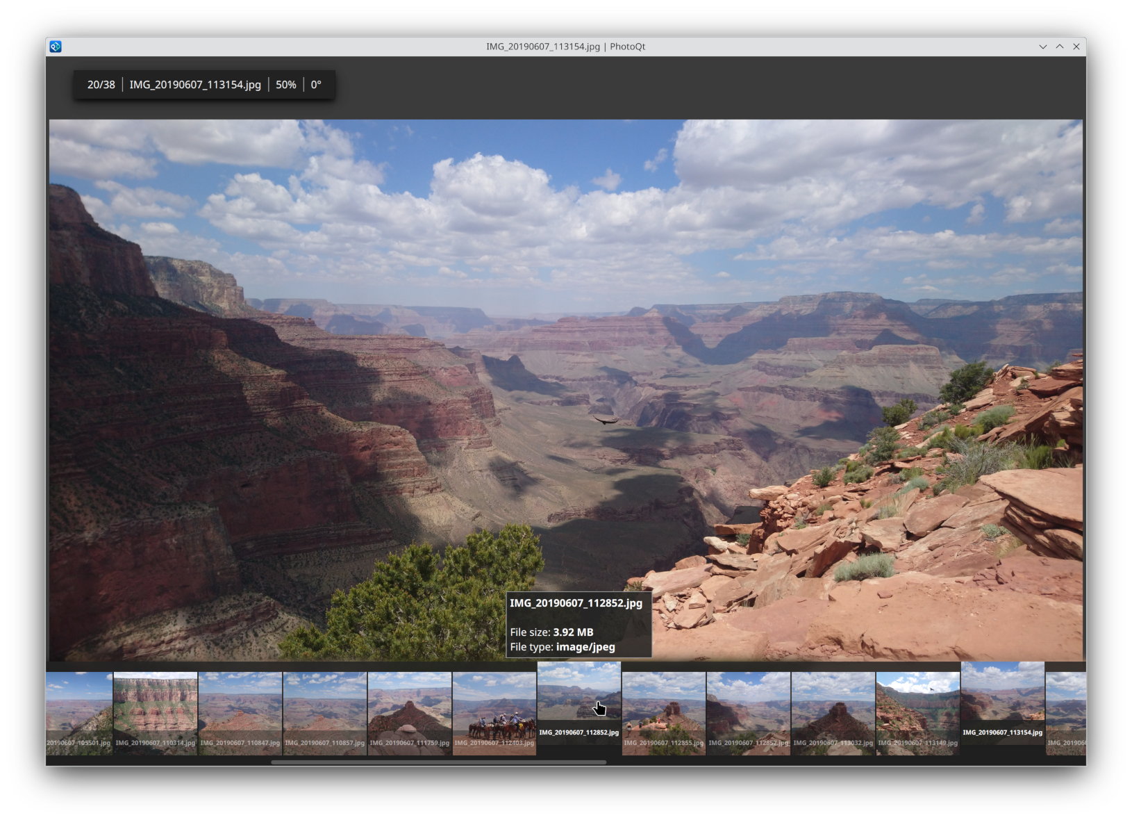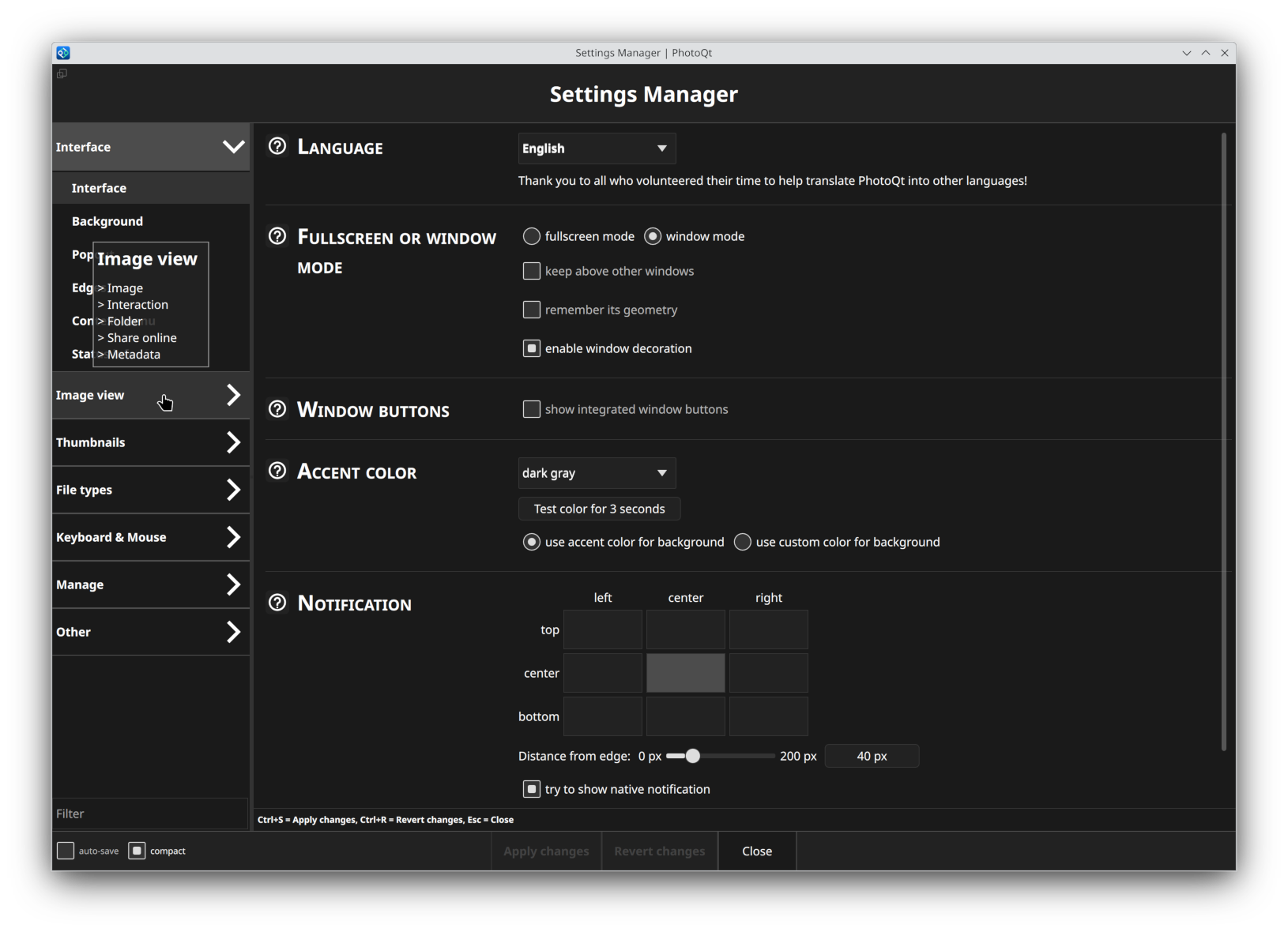 PhotoQt is an image viewer that provides a simple and uncluttered interface. Yet, hidden beneath the surface awaits a large array of features. Here are some of its main features (not an exhaustive list). Suggestions for new features are always welcome!
