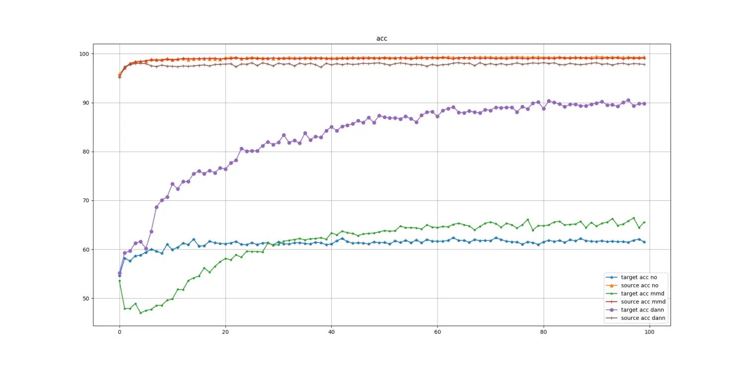 pytorch domain adaptation 环境要求 pytorch 1.0 torchvision 0.2.1 CUDA9.1 python3 数据 MNIST-->MNIST-M 框架 说明 整个框架跟DANN原论文都一样,在其中一些层添加了dropout和BN(model_3_channel.py) 无迁移方法:除去域判别器 mmd: 对feature extractor的特征进行多核mmd约束 DANN 结果 参考 https://arxiv.org/pdf/1505.07818.pdf[DANN]