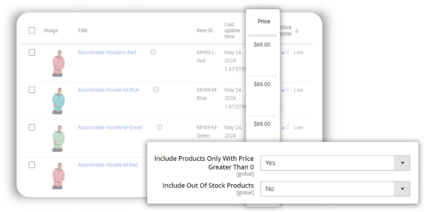 To avoid such cases, the Magento Google Product Feed module comes with product filters. They help you define whether to include free, configurable, and out-of-stock items to the feed. So, you select only relevant products.