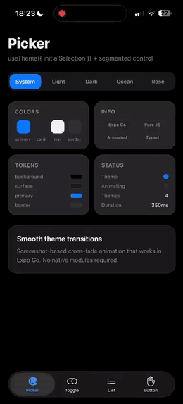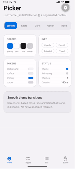 Smooth, animated theme transitions for React Native. Expo Go compatible, powered by Reanimated.