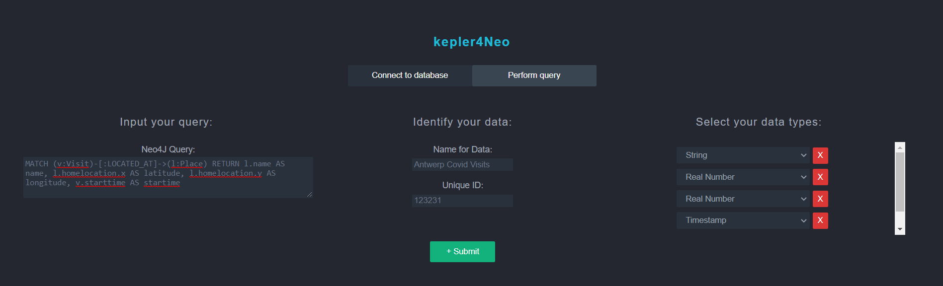kepler4Neo is an application that lets you easily transfer data from a Neo4J database on to a kepler.gl map. Use kepler4Neo to quickly build dynamic visualizations of your geospatial Neo4J data.