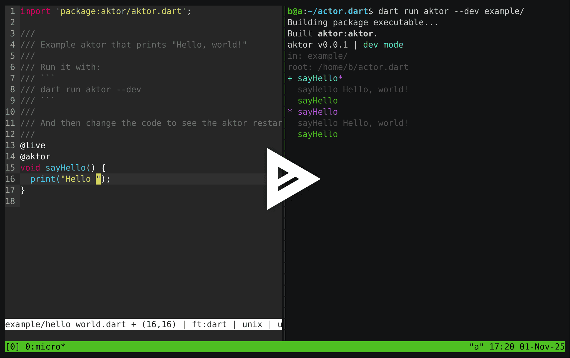 dart run aktor --devNow, change the code and see the aktor restart!