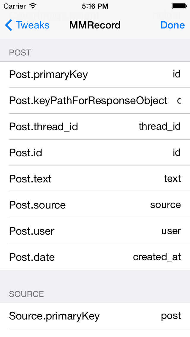 })MMRecord also provides the TweakModel subspec that implements support for Facebook Tweaks. You can use Tweaks to modify most MMRecord parsing and population parameters. This can be useful if you're working on an app where the API is in flux and is still being actively developed. The UI for Tweaks will show you a list of MMRecord entities in your data model, the primary key for each entity, all of the keys used to populate various attributes, and the key path that points to instances of that entity in the data model. Here's how you use it.