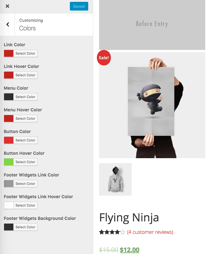 - Once WooCommerce is active there are a number of additional Customizer options for control of color in WooCommerce elements, this will be visible in the last panel of the Customizer