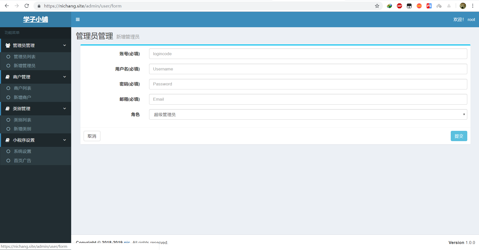 - 普通管理员:商家管理,商品类别管理,小程序设置