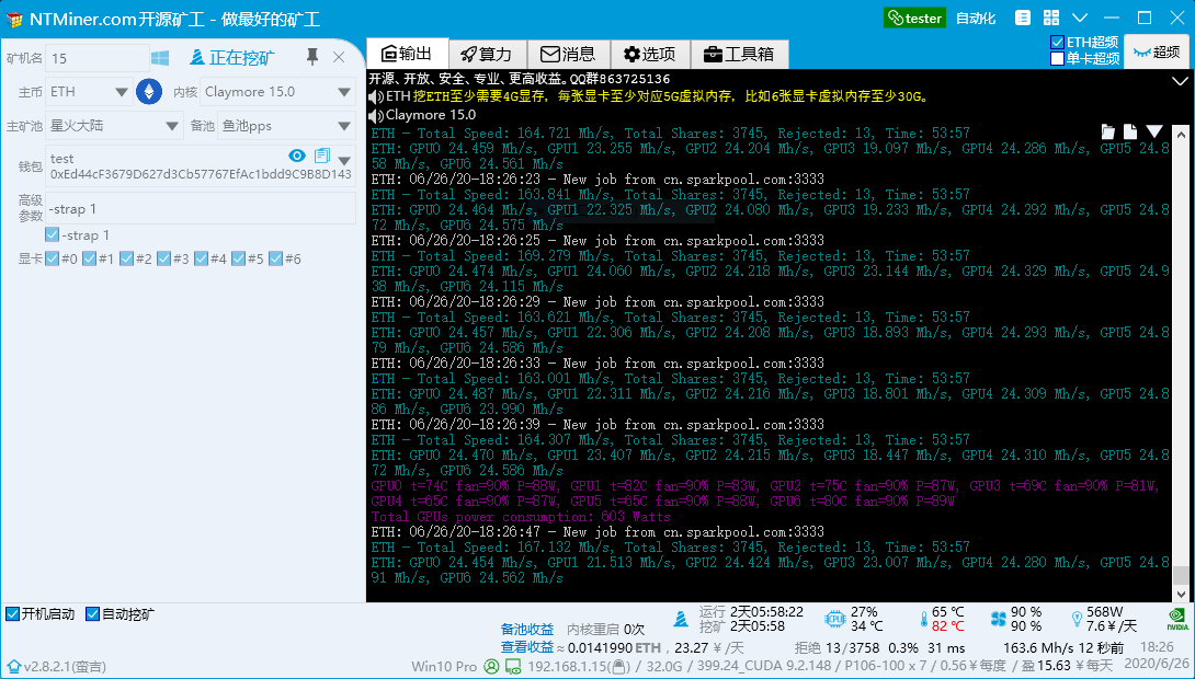 在线下载或者拷贝到矿机上打开即可开始挖矿了。下图是软件主界面,这是一台具有8张p106显卡的矿机: