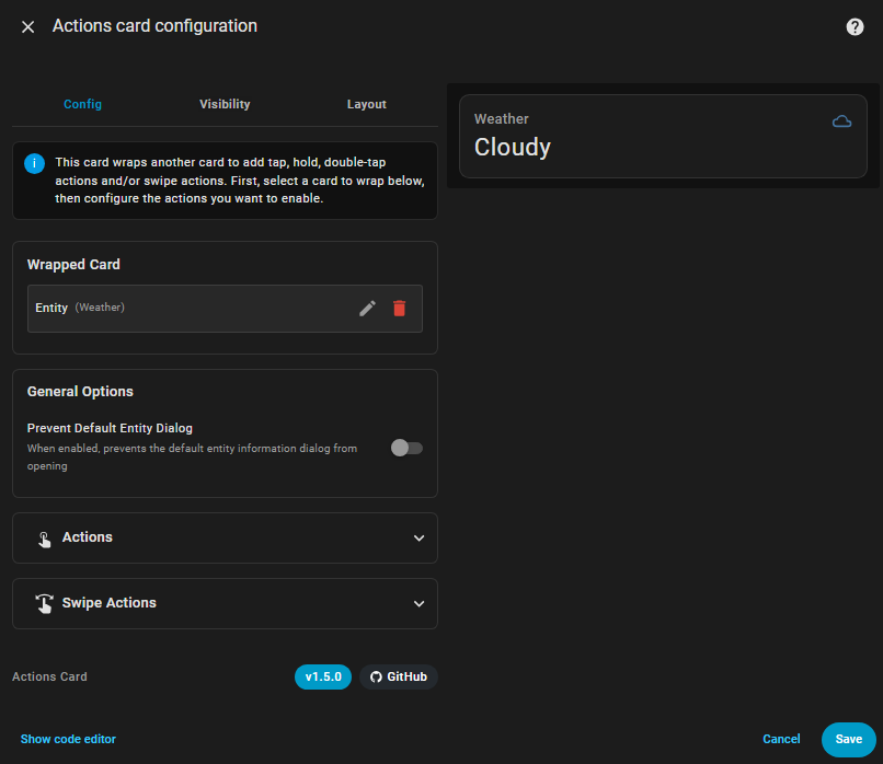 The Actions Card includes a visual editor that appears when you add or edit the card through the Home Assistant UI. Features include: