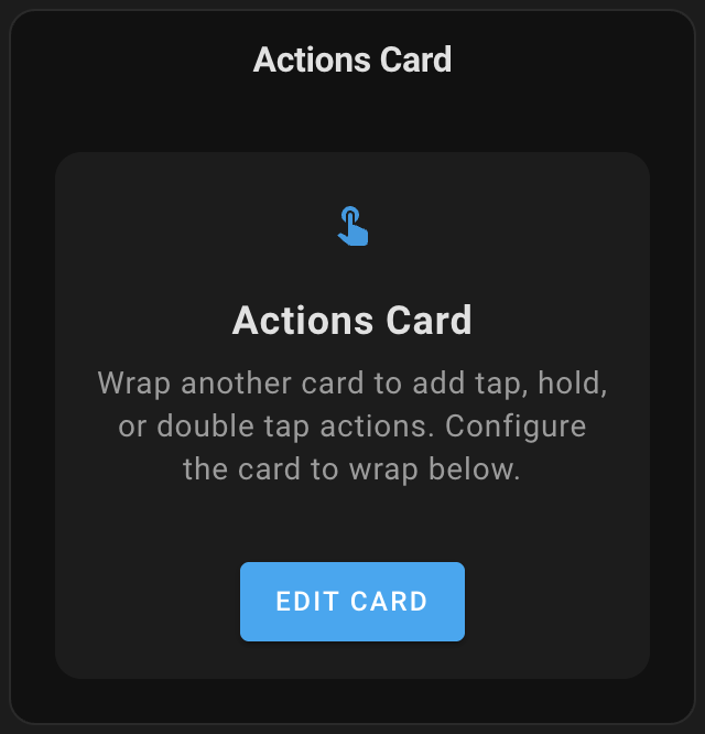 Actions Card is a wrapper for any Home Assistant card that adds interactive gestures and actions. Transform any standard or custom card into an interactive element without modifying the original card. With Actions Card, you can navigate to different views, toggle entities, call services, open URLs, and more—all from cards that normally don't support these interactions.
