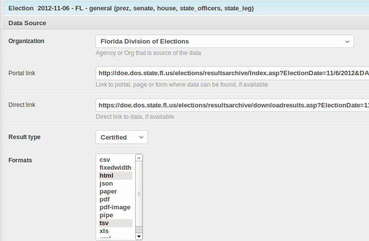 Formats - Election results come in many file formats, but we have identified a small collection that are most commonly used. These range from HTML (usually in tables) to CSV (comma separated values) to PDF, with some others. In some cases, it may be necessary to open the file and assess the format. If the state you are working on has a format that is not present in the admin, let us know and we'll figure out whether to add a new record or to place it within an existing format.