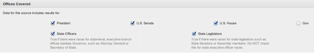 To capture the above in our data admin, you would create four separate Election entries: One for the general, one for the U.S. House runoffs, one for the special election, and a final entry for the gubernatorial recall. You would then select the appropriate offices in the Offices Covered section (see below).