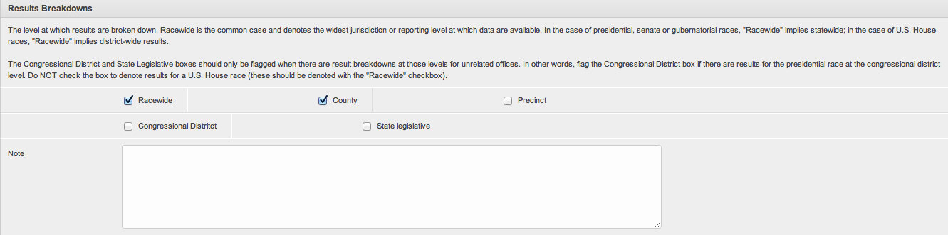 The second row of tabulation levels — Congressional District and State Legislaive — should only be flagged when there are result breakdowns at those levels for unrelated offices. In other words, flag the Congressional District box if there are results for the presidential race at the congressional district level. Do NOT check the box to denote results for a U.S. House race (these are covered by the "Racewide" checkbox).