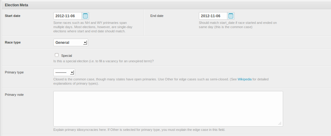Start date - The first date of the election. Most U.S. elections take place on a single day, so normally you'll only fill in this field (and not "end date").