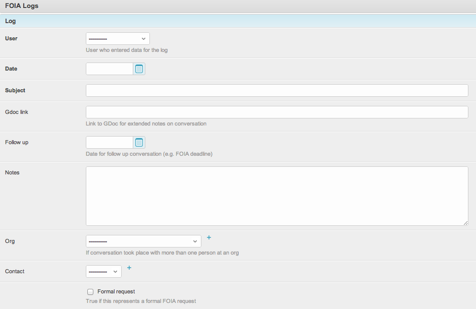 The FOIA contact logs should be used to track the history of important conversations with contacts at data source agencies. The types of things you should track in this section include: