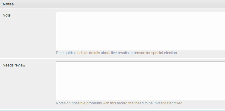Notes General notes about a particular data set that would be useful to know. These would include quirks about the data that may not be otherwise tracked by the data admin (e.g., the fact that D.C. has ward-level vote breakdowns) or differences in what is included at various reporting levels (Maryland, for instance, does not include absentee or provisional tallies in precinct-level results).