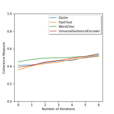The first figure shows some sample phrases which are appended to the seed query phrase “adobe photoshop” after the first iteration (for Reddit), it can be clearly seen that each phrase is totally pertinent to a given intent. The next figure shows the change in calinski-harabasz index with every iteration for Reddit, results for all the embeddings have been juxtaposed to get a better view of how changing the underlying embedding reflects on the cluster compactness. It can be inferred from the figure that after 3-4 iterations the algorithm converges, irrespective of the sentence/word representation used. The last graph shows results for topic modeling under the same settings as for KMeans version of the algorithm, the coherence measure shown is the average of all coherence values of the topics.