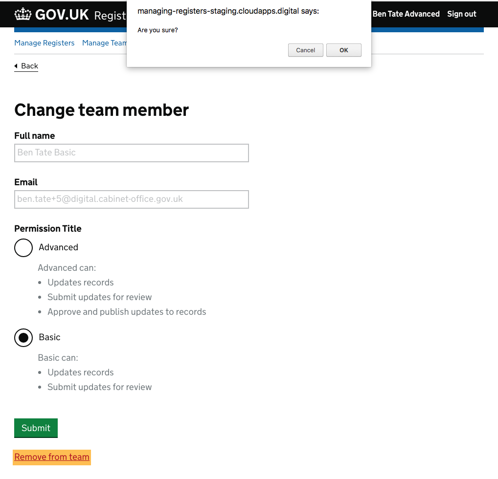As a custodian or an advanced user, if you remove a team member, you see the default browser alert, rather than the 'are you sure' pattern. When you confirm the removal of a team member you get an application error.