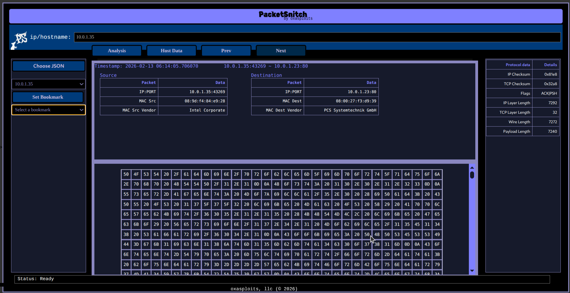 PacketSnitch is a Python tool for extracting payloads and rich metadata from network packet capture (.pcap) files. It generates testcases for fuzzing, protocol analysis, and research by saving raw packet data and detailed information about each packet, including protocol, entropy, geoip, banners, and more. The tool optionally performs active reconnaissance to enrich output with server banners, SSL certificate info, and web page titles.