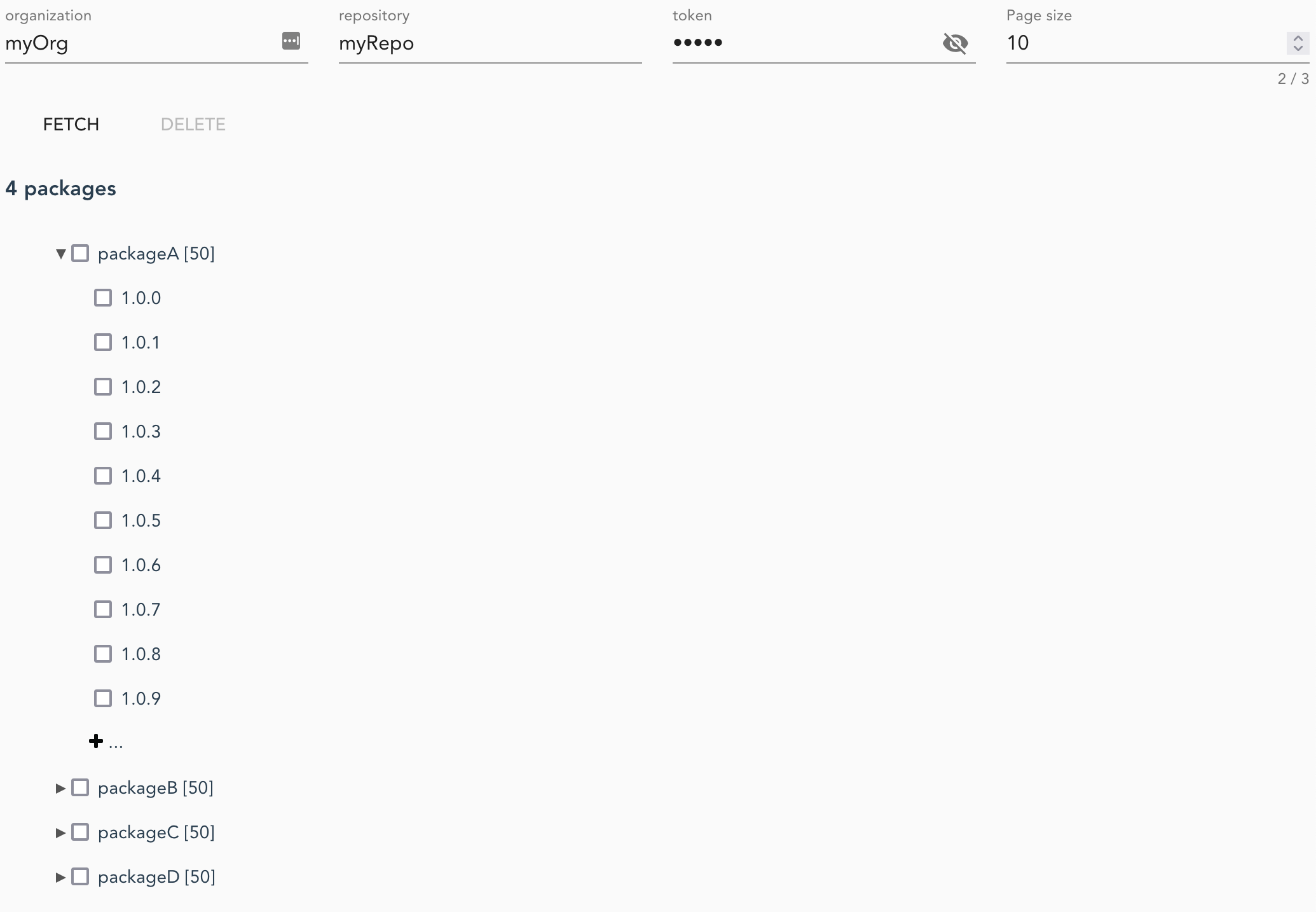 Fill in the form (three fields) and click Fetch to fetch the list of available packages. To fetch and display the list of versions, simply expand the package node in the tree. Query results are paginated (max page size is 100 as per Github specification).