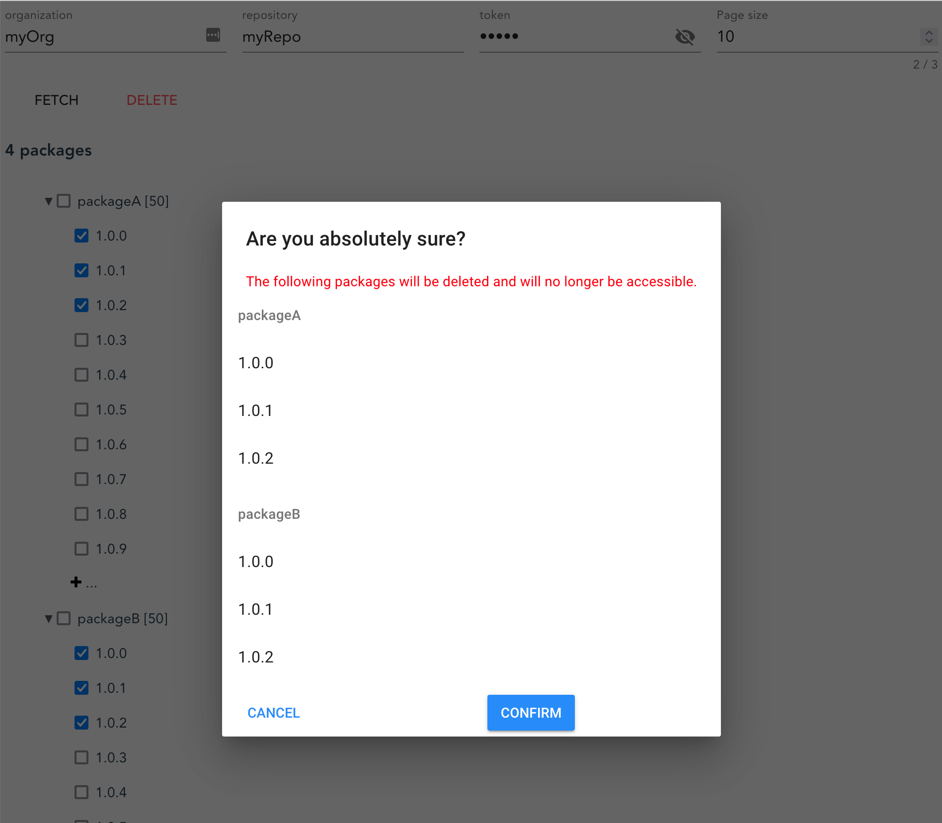 Package versions will be immediately deleted once Confirm is clicked.