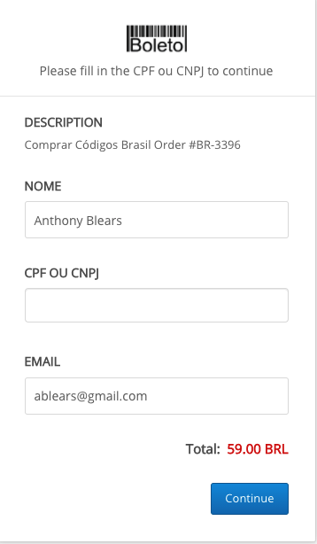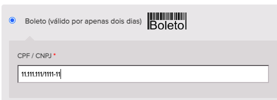 Choose Boleto and enter any CPF/CNPJ (eg 11.111.111/1111-11):