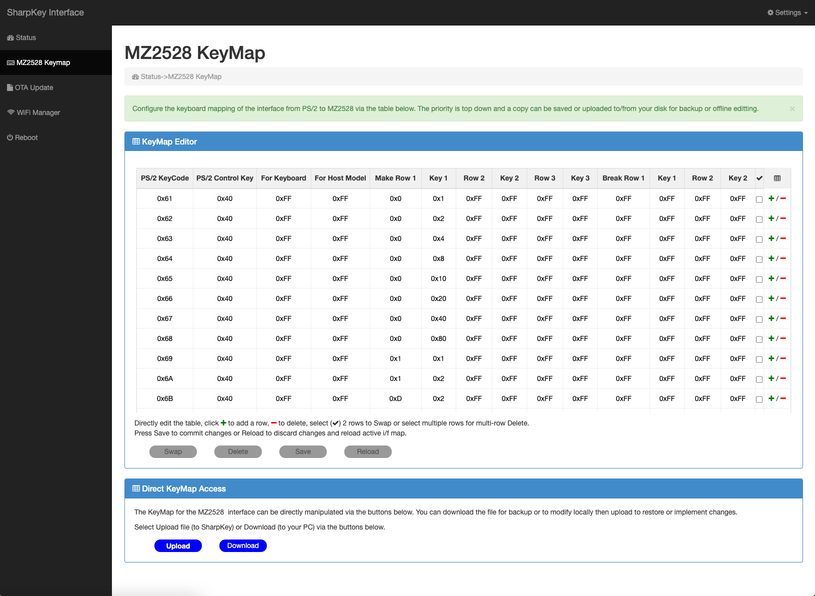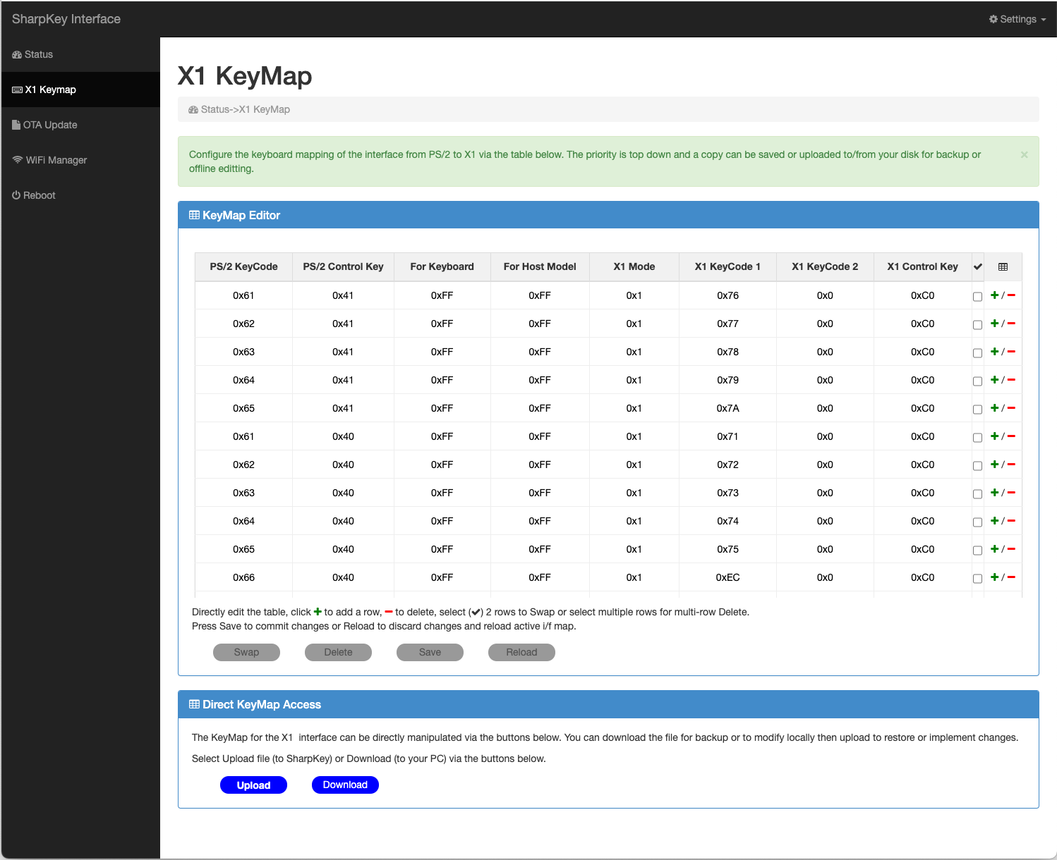 There exists however an edge case of a key not working or not working the way it should for an individual user, also other users may find their regional (country) keyboards not working well and these shortcomings needs to be addressed by the user who has more hands on experience. To this end, the SharpKey can be configured to map any PS/2 code or code combinations into a key sequence expected by the active host. Bluetooth scancodes are internally mapped to PS/2 scancodes so all keyboard type (PS/2 or Bluetooth) mapping is performed using PS/2 codes.