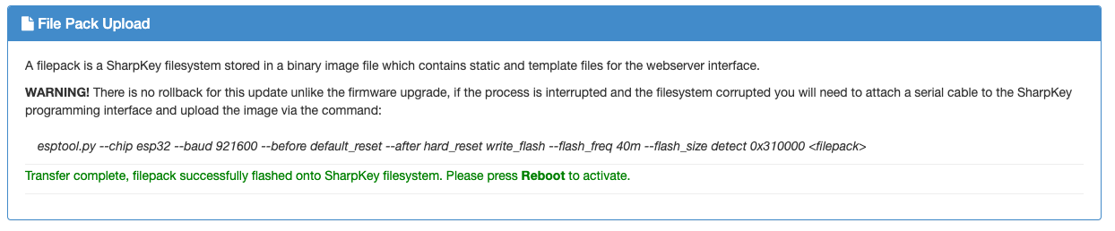 - a File Pack Upload panel which allows you to select a new filesystem image file and upload it into the SharpKey.